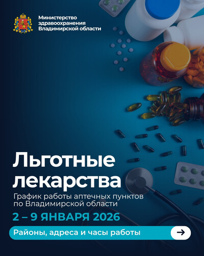 График работы аптечных пунктов и государственных медицинских учреждений, которые будут обеспечивать лекарственными препаратами наших жителей-льготников в январские праздничные дни 2026 года на территории области В случае каких-то вопросов по льготному лекарственному обеспечению для жителей Владимирской области в указанные праздничные дни будет работать «горячая линия» службы 122 кнопка 5 |